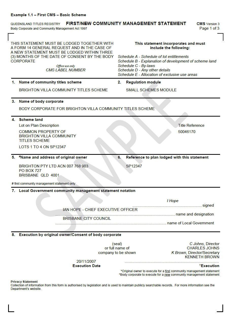 A Community Management Statement (CMS) includes five schedules that sets out the rules and development of a body corporate, contributions towards upkeep and any common property allocated to individual lots.A sample Community Management Statement looks like (click to enlarge):